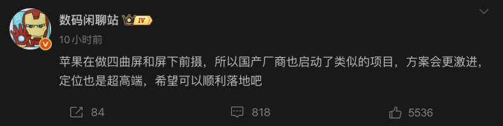 最新的爆料来自博主@数码闲聊站。其透露,苹果正在推进四曲屏以及屏下前摄相关方案,同时国内厂商也已启动类似项目,方案更为激进,定位为超高端产品。